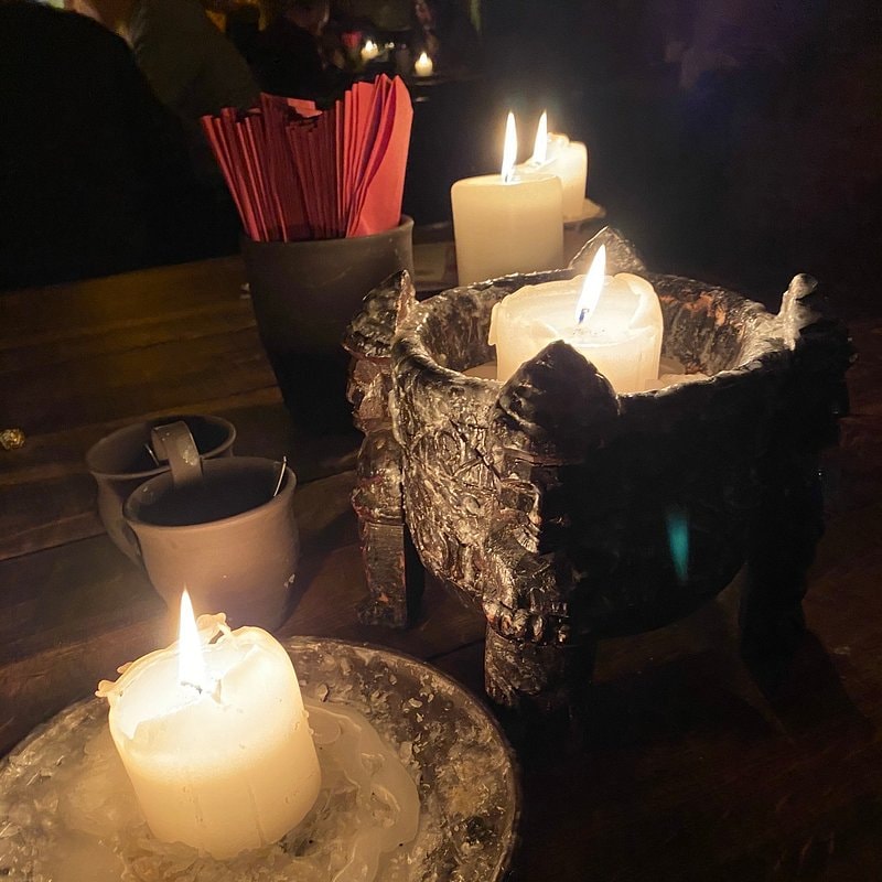 Все освещается только настоящими свечами, поэтому сидишь во мраке.