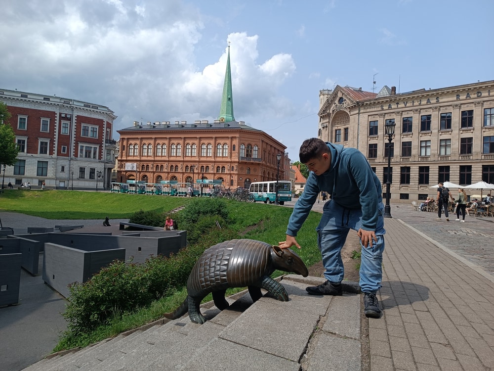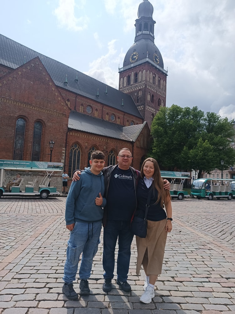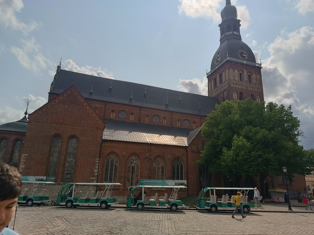Попросили прохожих нас снять на фоне главного рижского собора - Домской церкви. Вообще, по-русски говорят 95 процентов, мы прямо на русском спрашивали дорогу, и почти все нас понимали. Очень необычно после 20 лет в Германии. Домский собор - готическая базилика начала XIII века, я потом про нее еще расскажу.