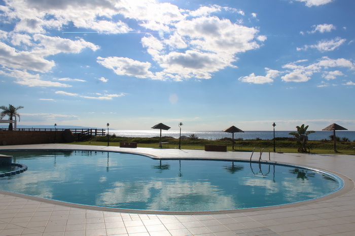Пляж частный и, соответственно, маленький; с лежаками.