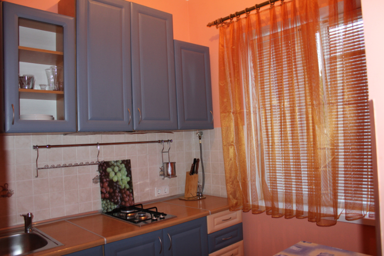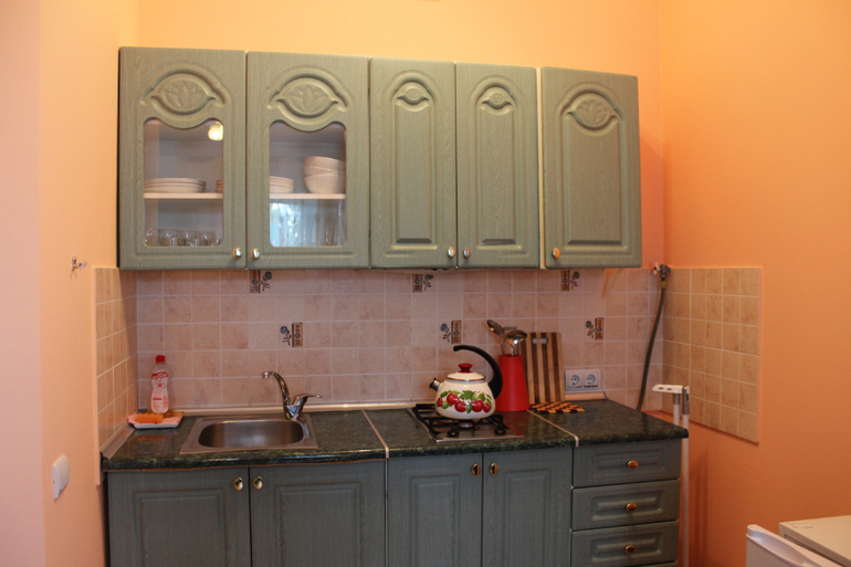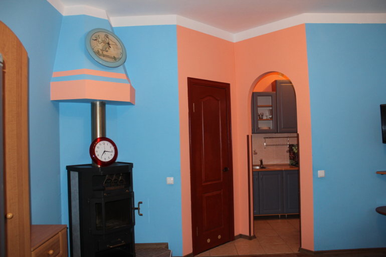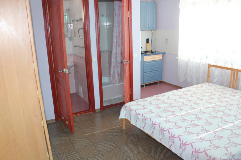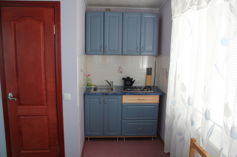 Гостиница состоит из 4 квартир-студий с кухонной зоной,общая площадь примерно по 20 м2(на каждом этаже по квартире).В номере есть кухня,санузел, спальная зона и балкон,а на 5 этаже большая лоджия-столовая..
