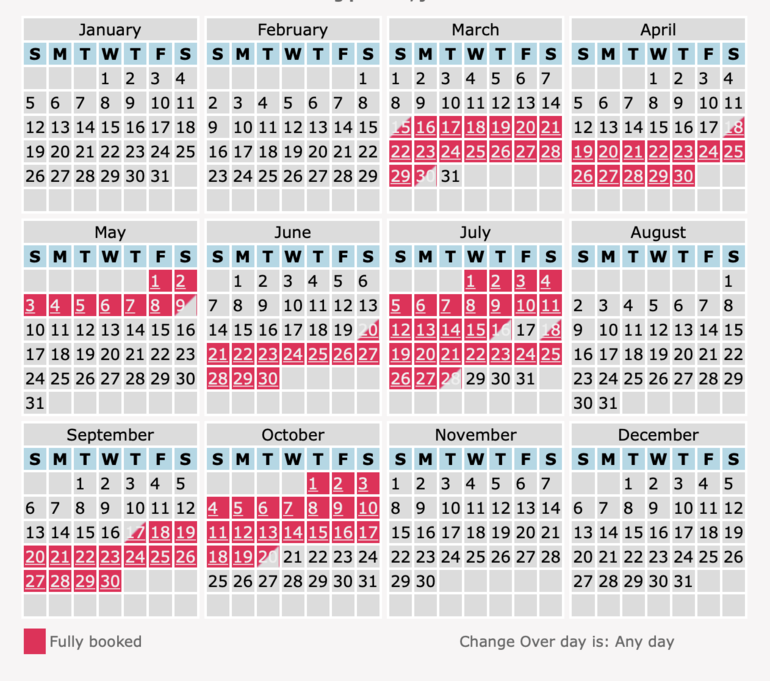 Календарь на 2020 год (красным отмечено то, что занято, серым - свободное).