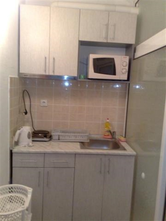 В кухня с гостиной: электрическая плита с духовкой, микроволновая печь, стиральная машина, вся необходимая посуда и кухонные принадлежности, двухкамерный холодильник, электрочайник, диван, обеденный стол со стульями, телевизор с кабельными канали, роутер, выход на балкон с видом на море.