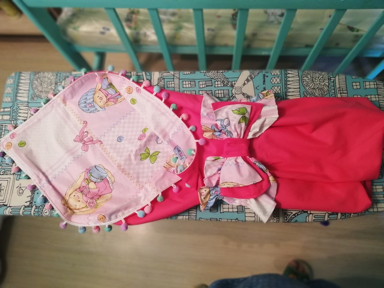 Долго думала, что в такую жару купить, решила в итоге сшить конверт из бязи без подкладки и боди без рукавов под него. Если что, то в машине разверну. А то муж голую кроху боится брать)))), а так и не жаркий и завернута.