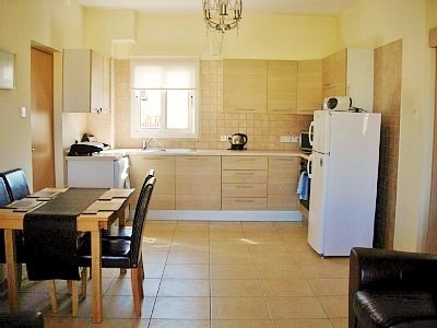 Квартира расположена на третьем этаже комплекса (имеется лифт). При входе в квартиру Вы попадаете в уютную гостиную открытого плана с диванами, телевизором с местными каналами, обеденной зоной на 4 персоны, полностью оборудованной кухней. В кухне имеется холодильник, стиральная машина, варочная поверхность, духовка, микроволновая печь, чайник, тостер.