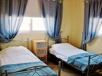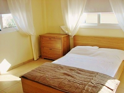В главной спальне - двуспальная кровать, во второй - две односпальные. В обеих спальнях имеются также встроенные шкафы и прикроватные тумбочки. В ванной комнате - ванна, раковина, туалет.