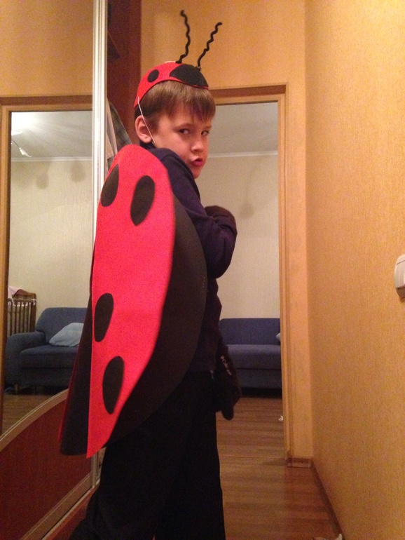 Я недавно делала костюм божьей коровки . Из цветного картона быстро прикольно и красиво. Картон разнообразные в мире бумаги на Автозаводской . Стоит не дорого костюм обошелся за максимум 100 рубл а голову в магазине веселая затея+ 100рубл
