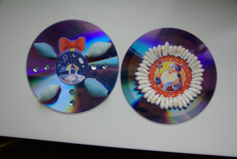 В качестве основы использованы старые CD диски. На обратную сторону приклеила картинку с новогодней тематикой. Муж потом просверлил дырочки, что бы можно было повесить на елку.