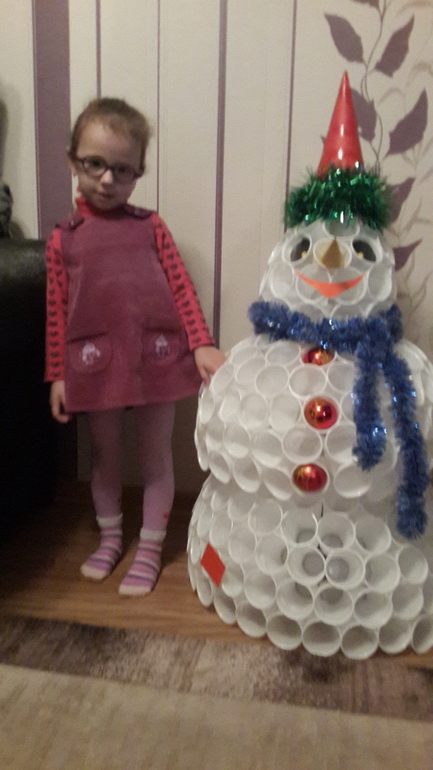 С первым комом проблем не было. По кругу соединяли стаканы. Первый ряд 26 шт, второй 25 и т.д. А вот со вторым повозились. Никак не получался меньшего радиуса, но потом догадались донышки немного смять и кое как получили что хотели. С головой аналогично поступили, смяли стаканы внутри круга. Между собой шары степлером не получилось скрепить, сшила обычными белыми нитками. Времени ушло конечно много, но результат того стоил. В саду все в восторге были))) А самое главное дочка очень довольная. Всю неделю мне рассказывает, что на нашего снеговика все приходят посмотреть)))