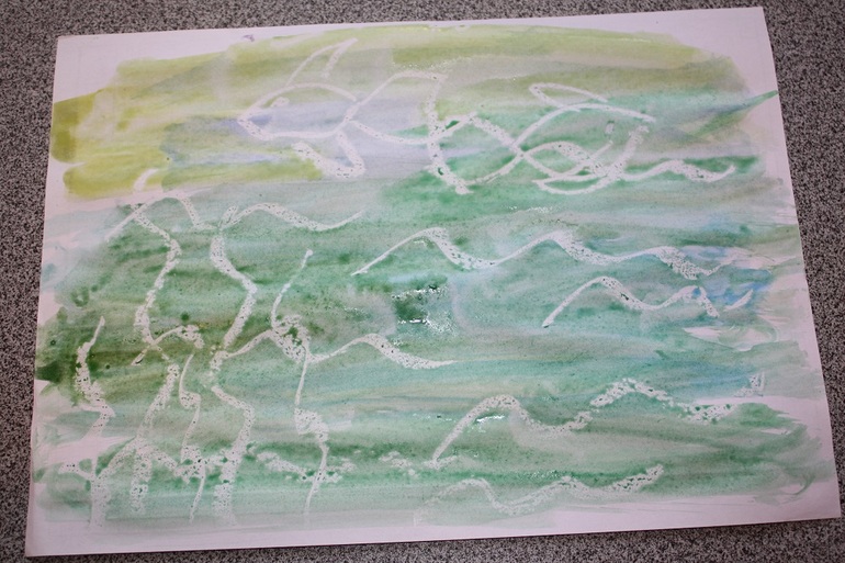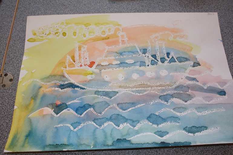 И второй рисунок это кораблик, который сделан с помощью обычной свечи, которую я использовала, как карандаш и нарисовала рисунок на белом листе бумаги,