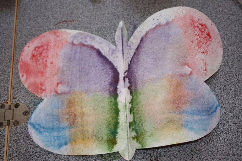4. Потом складываем бабочку и приглаживаем рукой лист, так краски смешиваются и получается всегда новый и оригинальный рисунок. Главное берите побольше краски и поменьше воды.