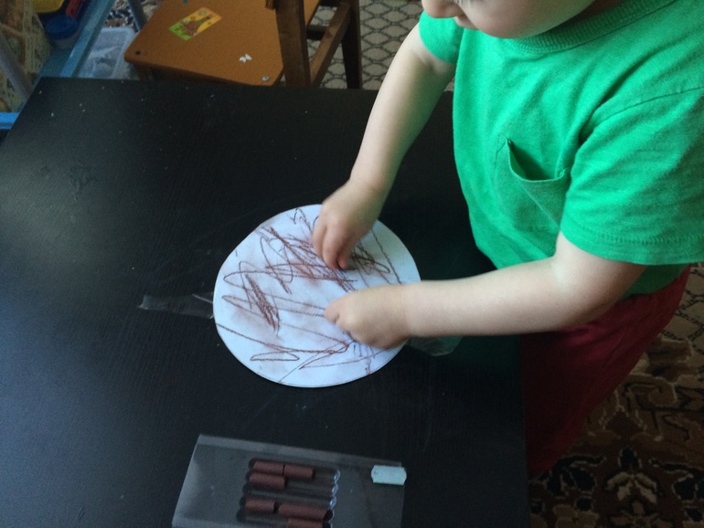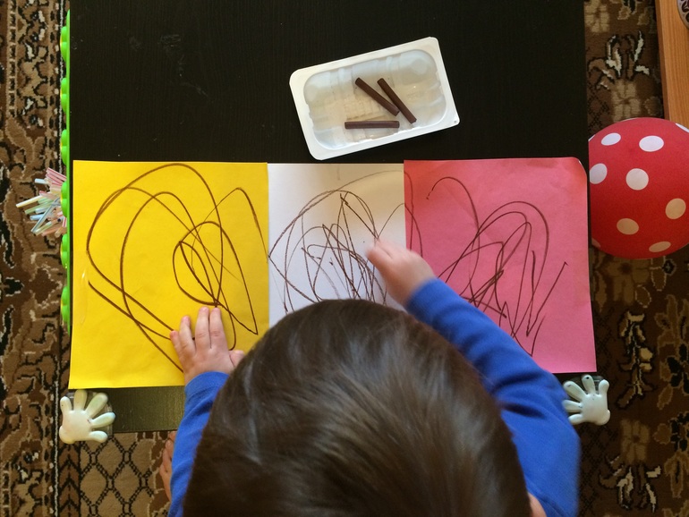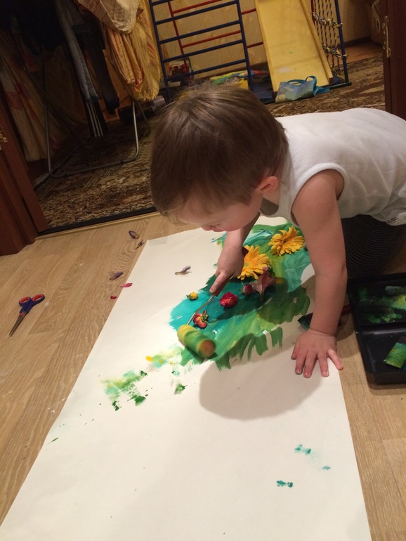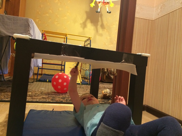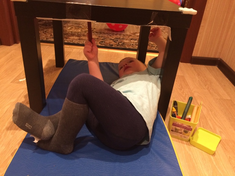 Еще один эксперимент в рисовании Яру почему- то очень приглянулся. Я приклеила ему бумагу к нижней стороне столешницы и он рисовал лежа под столом.