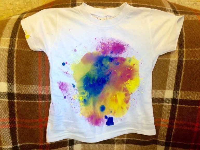 Наша конкурсная работа- рисование пипеткой. Мы нашли с Яром его белую совершенно скучную футболку и решили заняться дизайном