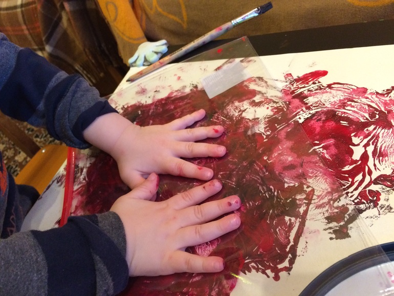 Из новых техник увлекла Яра следующая: сначала он нанес толстым слоем краску на полиэтиленовую папку
