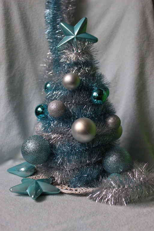 Делается очень просто- в пластиковой бутылке проделываются дырочки, проволокой прикрепляются шарики. Потом наматывается мишура, концы закреплены двухсторонним скотчем. И проволокой крепиться в подставке. И все:)