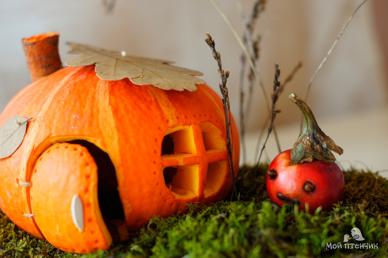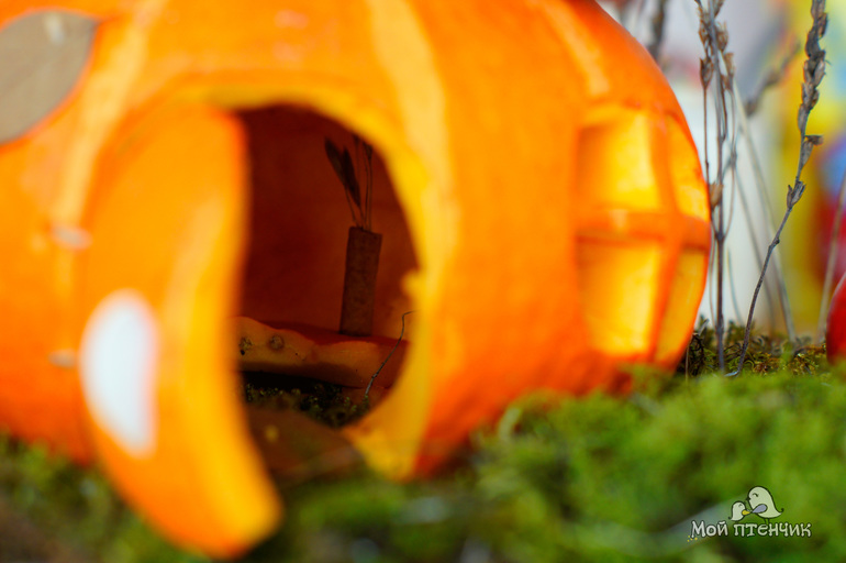 5. Ставим тыквенный домик на плотный картон (у меня два склеенных листа гафрокартона), укладываем вокруг мох (выбирайте кусочки разные по фактуре, хорошо, когда ещё и травинки есть), приклеиваем на клей момент кристалл или ПВА. Внутрь домика тоже укладываем мох.