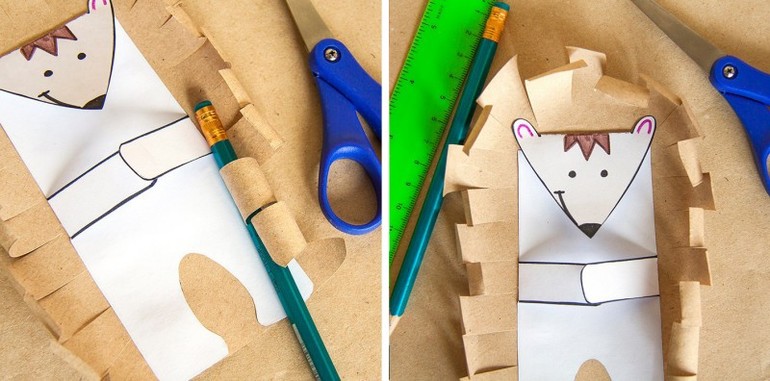 Дорисовали ему носик, ротик и ушки. Чтоб ежик был похож на ежика, решили иголки сделать из коричневой бумаги, поэтому на ней обвели белую заготовку карандашом и вырезали.