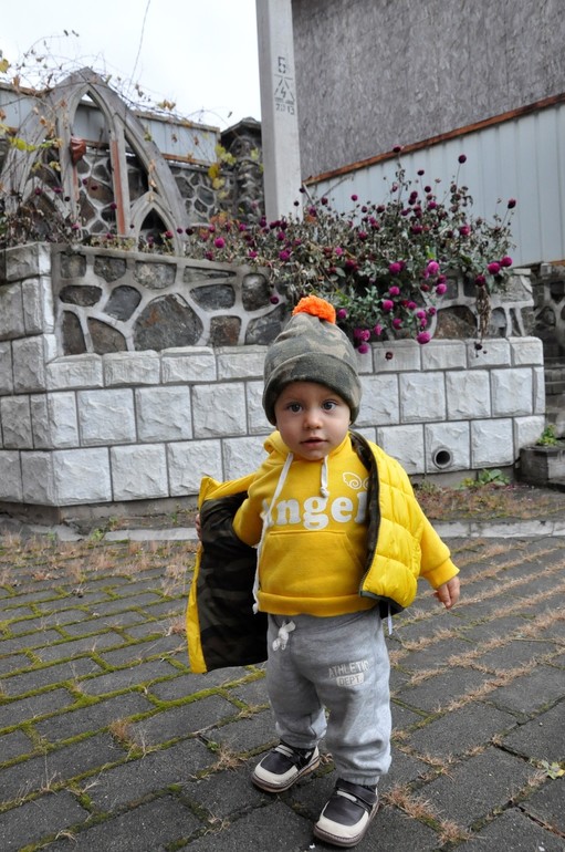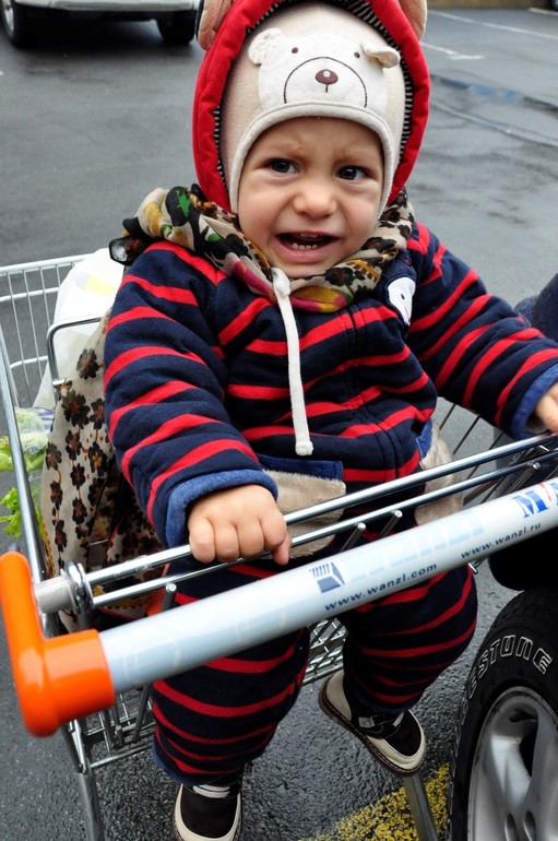 Рынок удобный. Недалеко от дома, парковка, крытый и с тележками. Там я обычно беру рыбу, мясо, свежие овощи и фрукты, а еще средства гигиены из японского магазина. Даня то сидит в тележке, то катит ее, то врезается в посетителей - не до фотографий. Щелкнула уже на подходе к машине, очень недоволен, что папарацци его настигли.