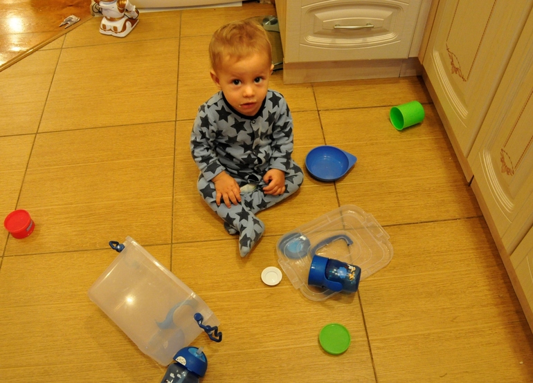 Достаю секретное оружие - пластиковую коробочку со всякими пластиковыми детскими штуками.Фото чуть смазано, тк мелкий аж трясется от счастья, когда все оттуда вытаскивает.