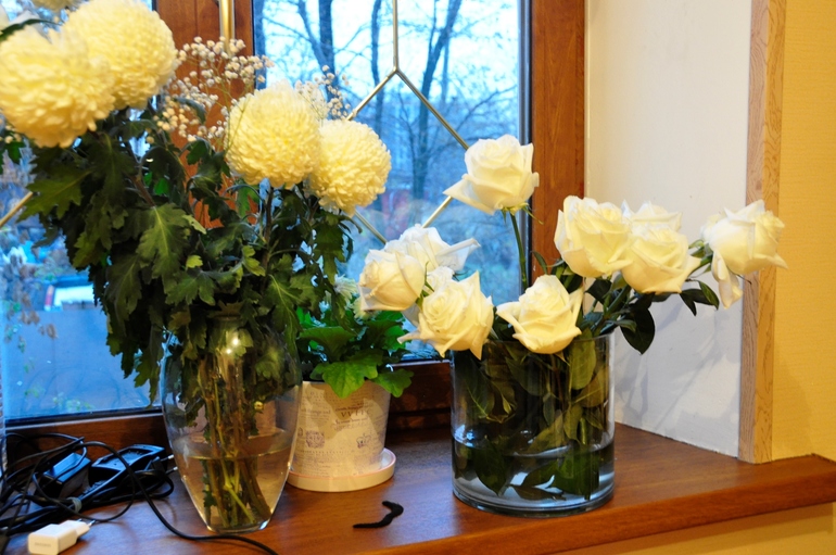 7.45 - пока папа с Ре слушают музыку, я иду готовить завтрак. Овсянка на молоке для взрослых. Каша Хайнц для малыша. Но первым делом я выпиваю кофе - иначе день для меня просто не начнется. На окне - оставшиеся в живых после Даниного дня рождения цветы, очень люблю букеты дома, у меня настроение сразу поднимается, когда их вижу.