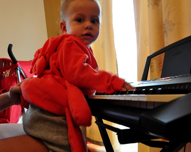 14.20 Даня решил проснуться раньше, никакие укачивания не помогли. Ну 2,5 часа сна тоже неплохо. Проснулся в хорошем настроении и почему то сразу потребовал поиграть на синтезаторе. Поскольку играет он у меня на коленях, а фотик тяжелый, то ракурс получился немного странным.