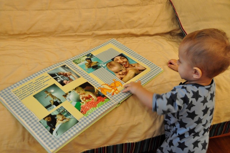 11.15 Мы уже дома. Разбираем покупки, играем немного. Читает любимую книжку имени самого себя - сделала ее к годовасию, очень плотные листы, так что нечаянно малыш не порвет. А специально и не пробует.