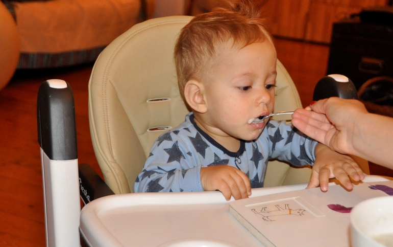 8.10 - пришли мои парни и сели за стол. Завтрак - это единственное время, когда мы едим все вместе. Я правда ем украдкой, ложку себе - две в господина, пока он не пытается вырваться. Но сегодня каша съедена полностью.