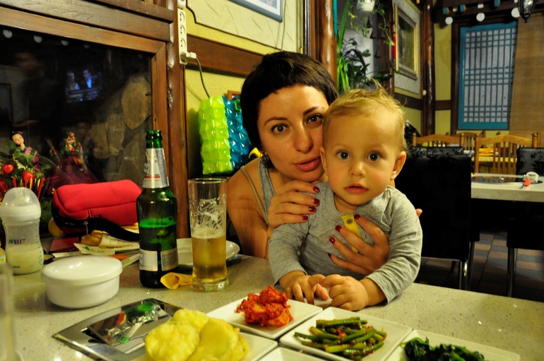 17.40. Решили поужинать в корейском ресторане. В силу близости к Азии у нас много аутентичных и недорогих мест. Даня тоже поужинал - цветной капустой и рисом, ну а я оторвалась с острыми закусками, супами и мясом. Ре сшибал с ног официантов, очаровывал корейских посетителей и даже пытался обниматься с двухгодовалой девочкой - та как истинная леди не далась и убежала.