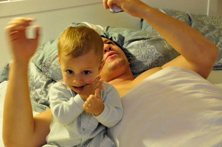 6.47 - подъем. Я в это время не то, что фотографировать, даже шевелиться не могу. Не понимаю, как у двух Сов появился такой экстремальный Жаворонок. Встать раньше ребенка и сделать всякие йоги я даже не мечтаю, я и с Ре не встаю, еще час мелкий ползает по нашим обездвиженным телам, а мы ему периодически даем то игрушку, то телефон, то сами от него получаем ногой в глаз. Таки я сегодня напряглась и сфотографировала утреннюю возню. Знакомьтесь - мистер Данюскин и его слуги.