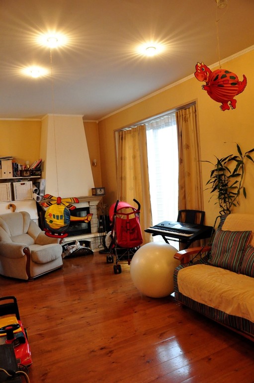 11.50 Заснул. Недавно мы перешли на один сон - с 12 до 3х, а еще недавнее научились спать в квартире, а не в коляске, катающейся по уличным колдобинам. Я долго к этому шла и наконец то стало получаться! Теперь у меня есть время на домашние и личные дела, а гуляем мы ножками. Пока правда спит он в коляске, а не в кроватке, при открытом окне, и иногда приходится немного подкачивать, но это ерунда. Первым делом после того как уложила спать, убираю на место игрушки, вещи и тд - в условиях маленькой квартиры даже небольшой бардак смотрится ужасно. В коляске - ребенок, на потолке - украшения, оставшиеся после дня рождения.