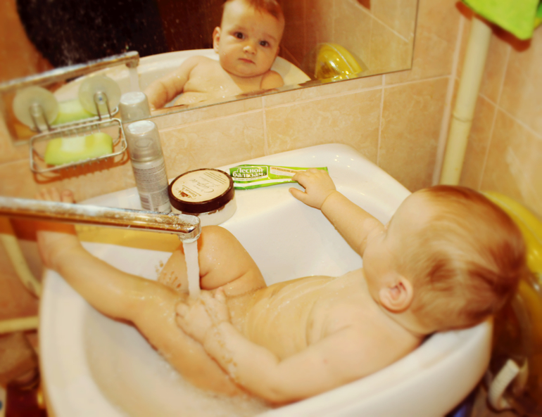 Подмываю малого. Кстати, как вы держите детей во время подмывания? Я уже эти 8,5 кг на руке не могу удержать, да и еще он вертится, все надо схватить. Поэтому тупо сажаю попой в раковину)) Обычно зубная паста, умывалки и прочее сразу попадают в Лехины лапы и в последствии улетают на пол, но сегодня повезло - он увлечен фотиком.