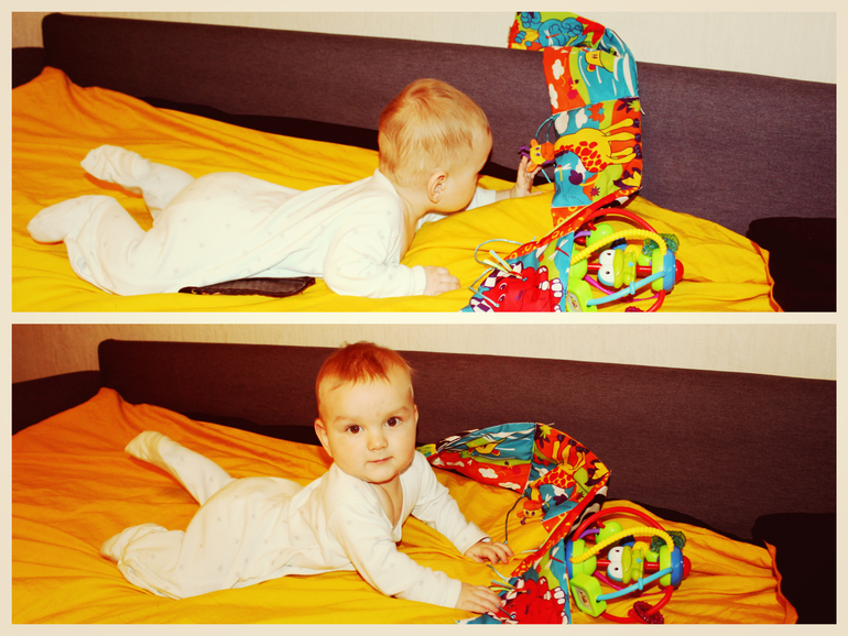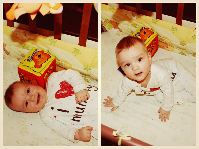 В шесть с копейками ребенок уже подустал, положила в кровать, дала игрухи. Возится, потихоньку засыпает. В итоге нифига не уснул, возился и дремал немного до 19-30, потом пришел с работы папа и вынул из кровати.
