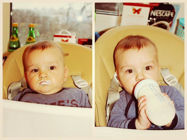 Около 10 кормлю Леху кашей, мы пережили мини-истерику (увидел бутылку и начал орать, а я долго кашу мешала).