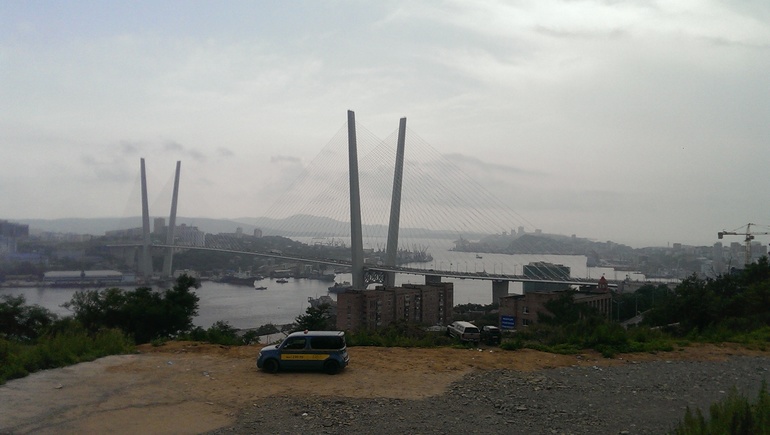 Сама бухта. И вот там далеко, левее белой "свечки", практически посередине, мост уже на Русский остров.