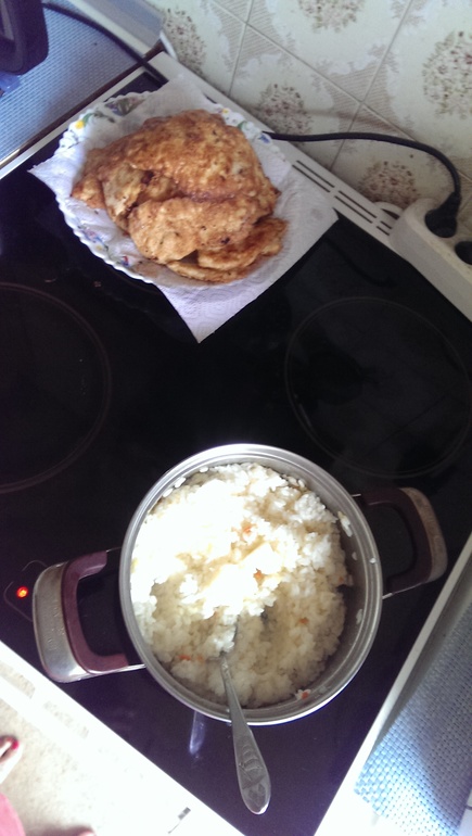 На ужин будет шницель или как он там называется из куриной грудки. И рис. И салат из помидоров/огурцов/лука/майонеза.