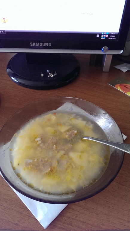 в 14: 17 я закончила мытье. И решила отобедать. Суп с фрикадельками. У мужа, кстати, тоже самое было. На кухне не было желания кушать, ела перед компом )))
