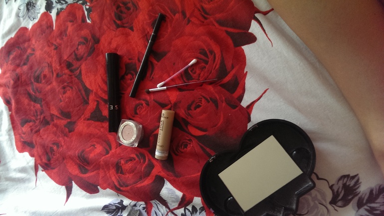 Маня продолжает валяться на пледе, так что кровать не заправлена. Косметики я использую по минимуму. Тональник не использую вообще.