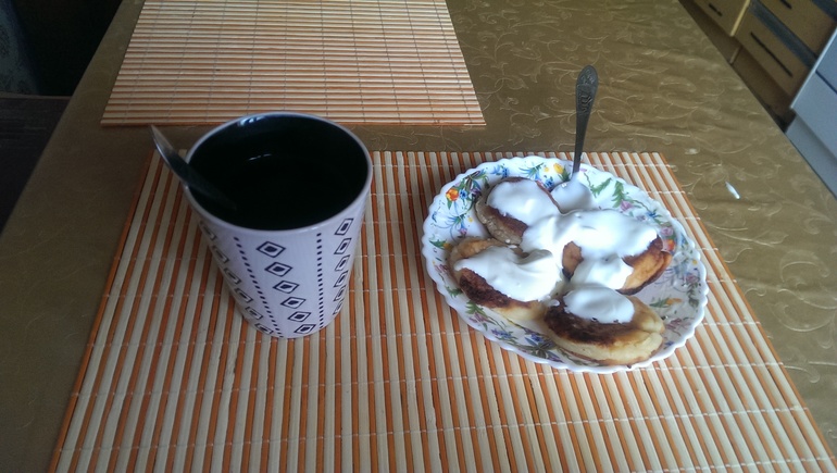Это завтрак для мужа. Чай и сырники со сметаной. Сырники накануне пожарила. Если мне утром никуда не надо, то после ухода мужа я позволяю себе еще поспать. )))