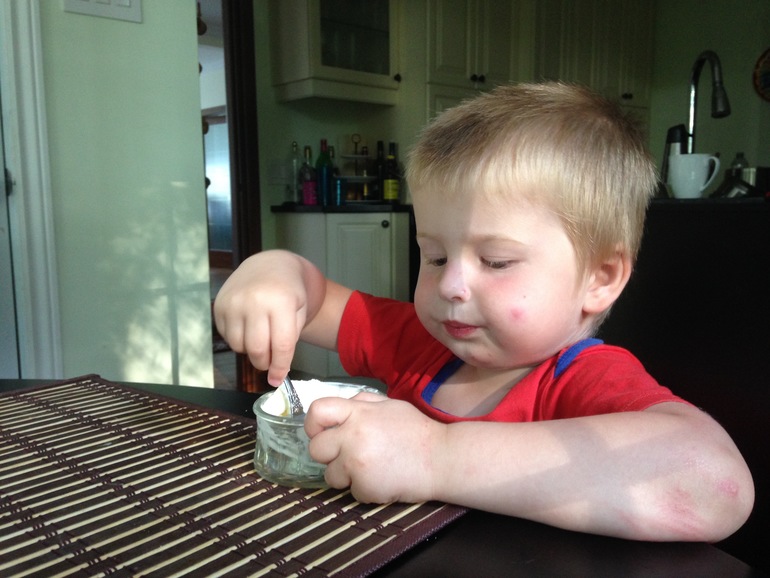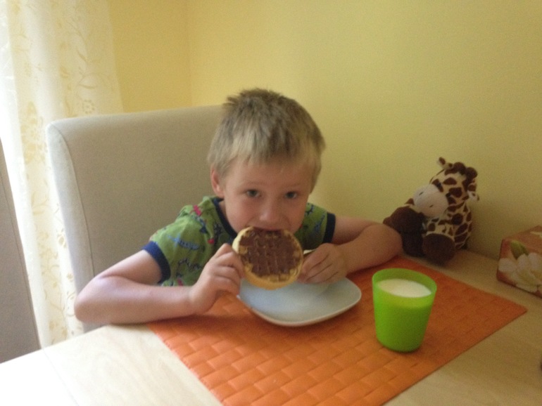 Умываемся, завтракаем. У детишек вафли с нутеллой, у нас йогурт.
