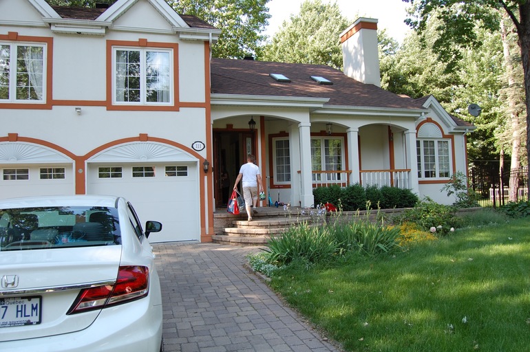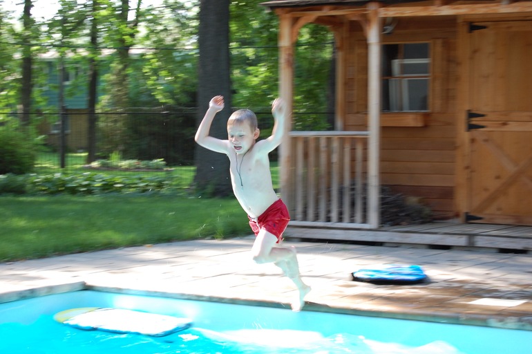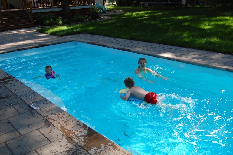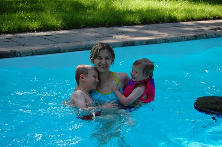 Забрали, едем к родственникам купаться в бассейне. Их самих нет, они в отъезде. Есть только бабушка и зверье.