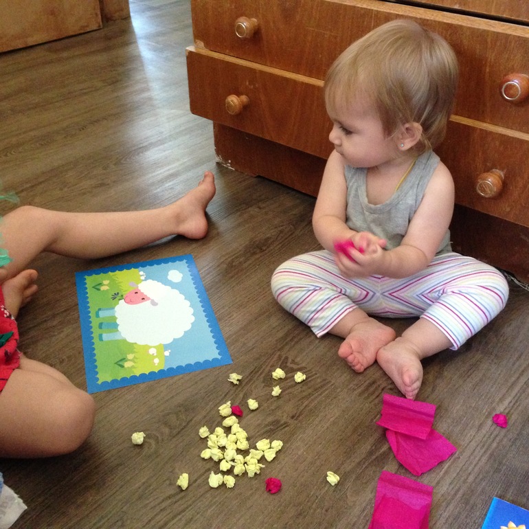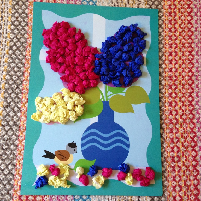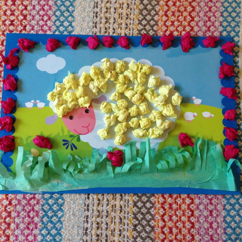 Потом делали поделку из гофрированной бумаги. Соня тоже помогала - комкала бумагу и клеила на шаблон.![]()