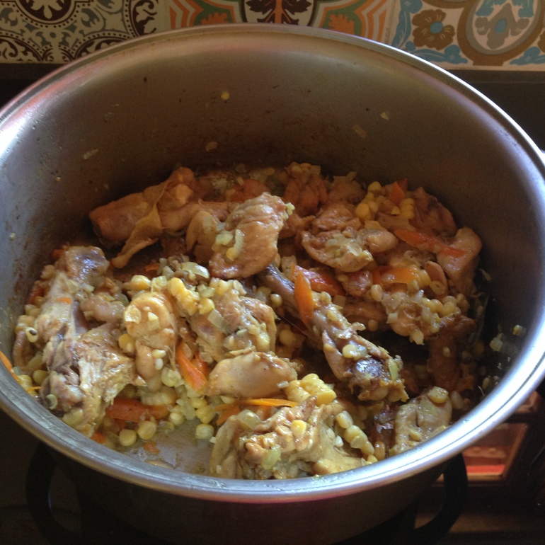 Курицу я с вечера оставила замоченной в куркуме и соли. А сегодня выложила ее на дно кастрюли и обжарила. Потом добавила к ней мелко нарезанный лук и чеснок. Через пару минут морковь. Потом кукурузу (вчера сварила), все немного потушила и залила кипятком.