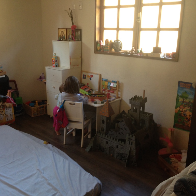 Соня как раз к обеду решила проснуться. Мы покушали, попили чай. Пока дети бегали за кошаком, я убрала посуду. Потом мы сели заниматься.