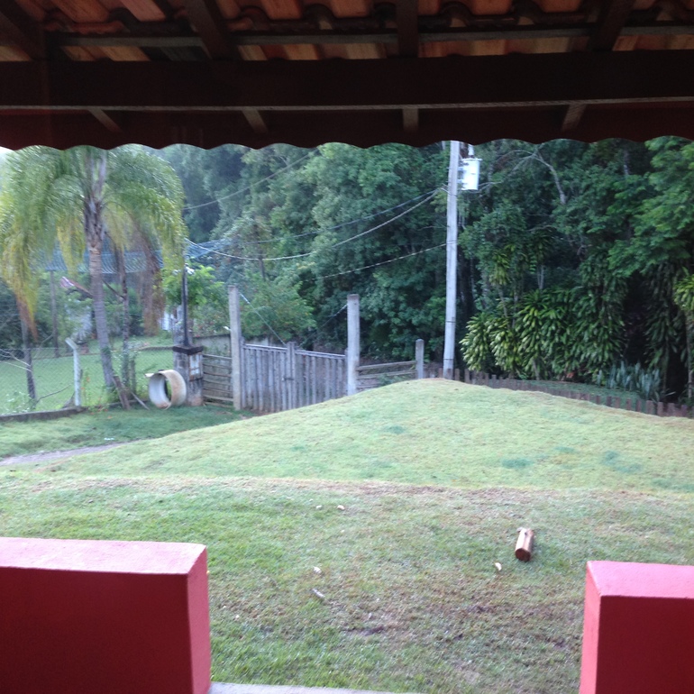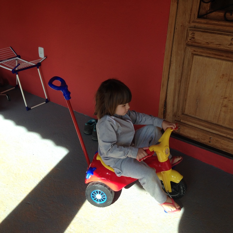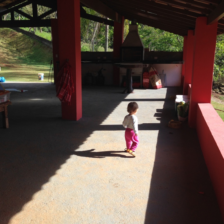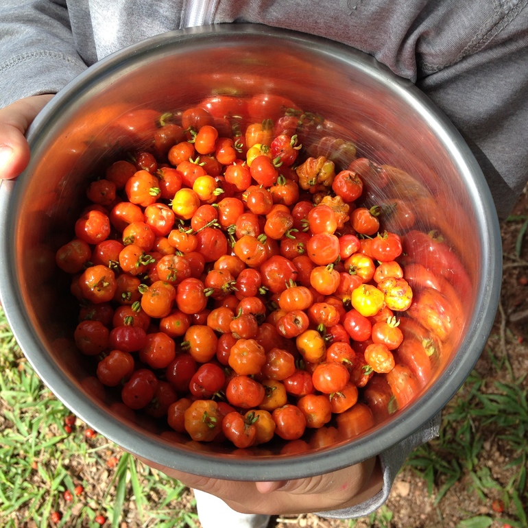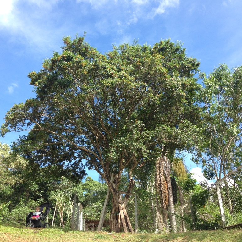 А потом мне надо было сделать важное дело, но Соню пришлось посадить в коляску, иначе за ней надо ходить и контролировать. А мне надо было собрать питангу. А то поспело очень много, вся земля усеянна ей и ветки облепленны.