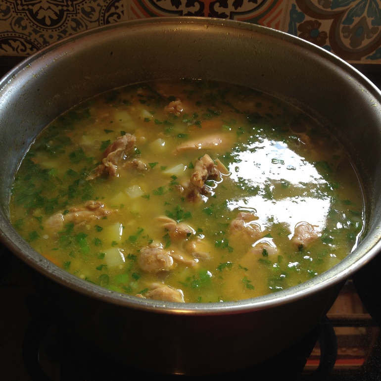 Бросила лаврушку и оставила вариться минут на 40. Затем бросила картошку. Как только картошка сварилась, добавила зелень (петрушку и лук) и выключила. Минут 10 настаивалось.