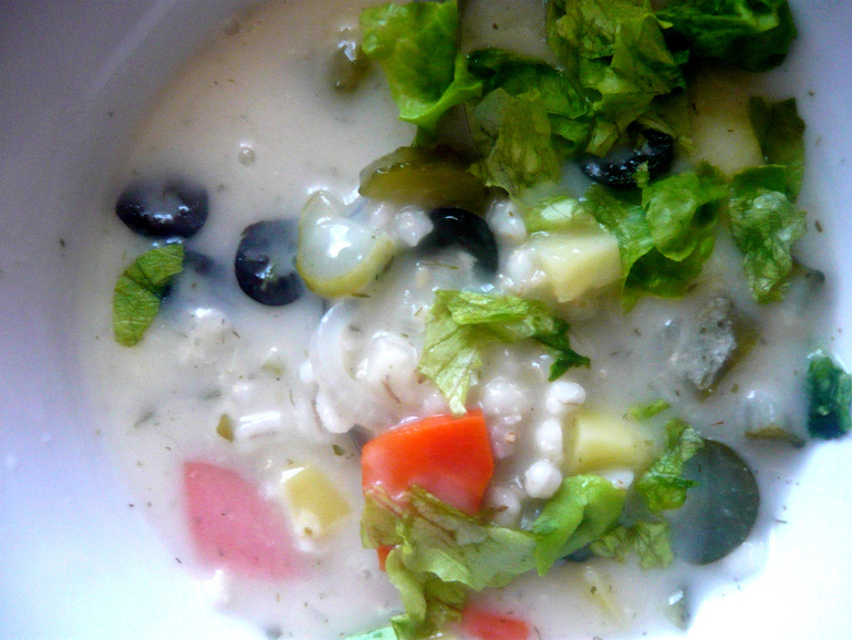 Варим перловку, затем сол. огурчики+овощи. Я всё крупно режу, лук, морковь не обжариваю. Тем временем в блендере вертятся: мука+плав. сыр+чеснок+стакан воды. Выливаем в кастрюлю, доводим до кипения, добавляем зелень, оливки, соль. Оливки добавляю только в свою тарелку, деткам нет. И ещё деткам маленько взбалтываю в блендере как пюре почти.