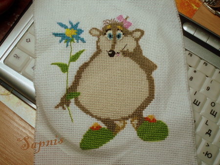 Lea вышивала несколько работ, среди них: наволочка с симметричным орнаментом и весёлую мышку или хомячка.
