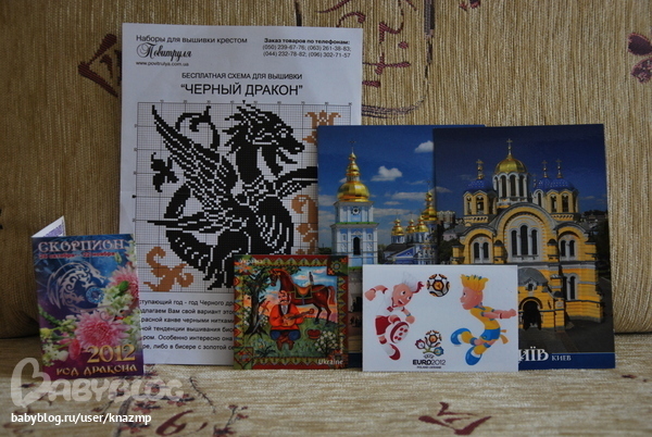 две открытки с изображением храмов Киева, календарик с моим знаком зодиака, схема для моего прожорливого хомячка))) и конечно же суперские магниты (такой колоритный казак)))