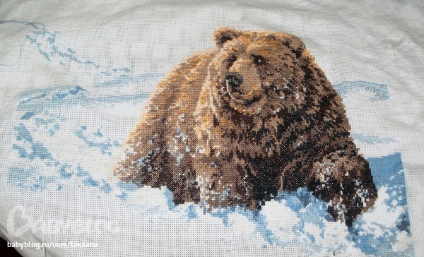 Мишка такой упитанный, клевый! НЕ вздумай его бросать, пошила немного белым по прямой(том более по прямой намного быстрее шить), как надоест сразу бери другую вышивку, так и дело продвигаться будет!