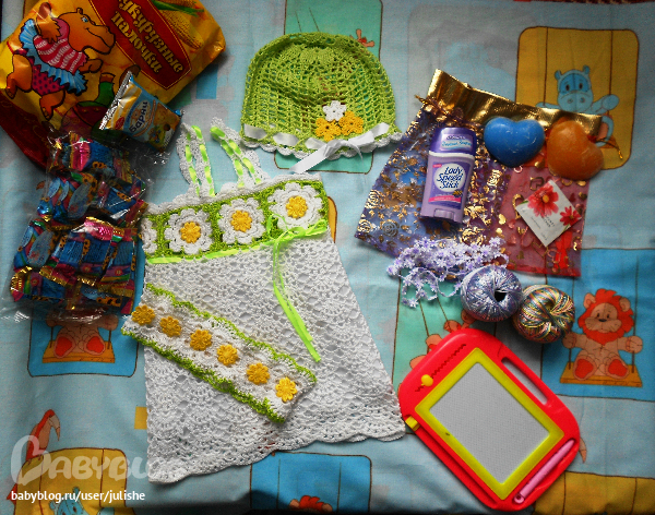 Осуществила нашу мечту прям!!! Такой потрясающий сарафанчик для Полины, а с ним ещё шапочка и повязка!!! Вкусности ещё разные)) Ниточки, что очень пригодится!!! Красивая тесьма, разные подарочки для души и душа))) Юлечка, Спасибо!! Мужу тоже перепало кое что, то чего на фото нет, уволок))) Сфотографирую свою дочу в нарядах, пришлю фото)