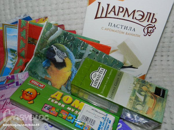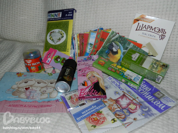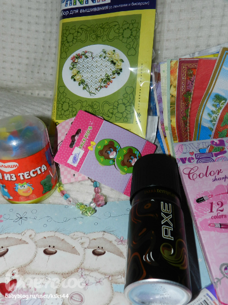 И столько всего там было!!! Красота!!! Огромное спасибо Танюше за такие чудесные подарочки для нас с малявочкой!!! Всем угодили! Алинка тесто для лепки утащила в тот же миг, и сразу лепить пирожки, как баба Капа из Лунтика! Потом в ход пошли и доминошки и карандашики с альбомом! Вообщем, всё в дело! А уж мой хомяк зачах над салфеточками (их так много!) Чудесный наборчик для вышивки лентами! Уж теперь точно я освою эту технику! А журнал-то как кстати! Именно этого номера у меня и нет (не успела купить, разобрали)! Сластюшки прибрали, абы не слиплось))), а "драгоценности" спрятали в шкатулочку, естественно, предварительно примерив на все места!))))))))))))))